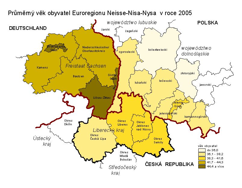 Průměrný věk obyvatel Euroregionu Neisse-Nisa-Nysa v roce 2005 |