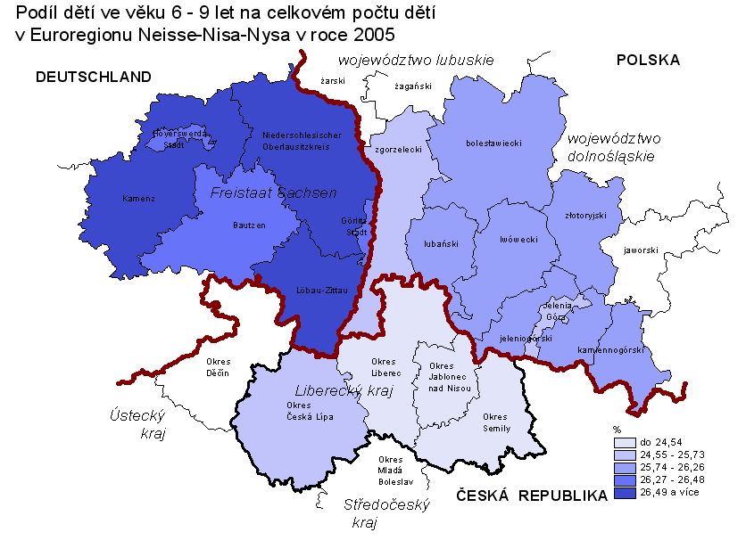 Podíl dětí ve věku 6 – 9 let na celkovém počtu dětí v Euroregionu Neisse-Nisa-Nysa v roce 2005 |