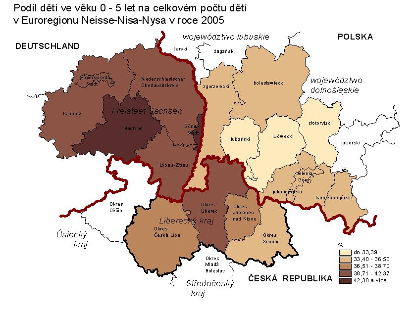 Podíl dětí ve věku 0 – 5 let na celkovém počtu dětí v Euroregionu Neisse-Nisa-Nysa v roce 2005 |