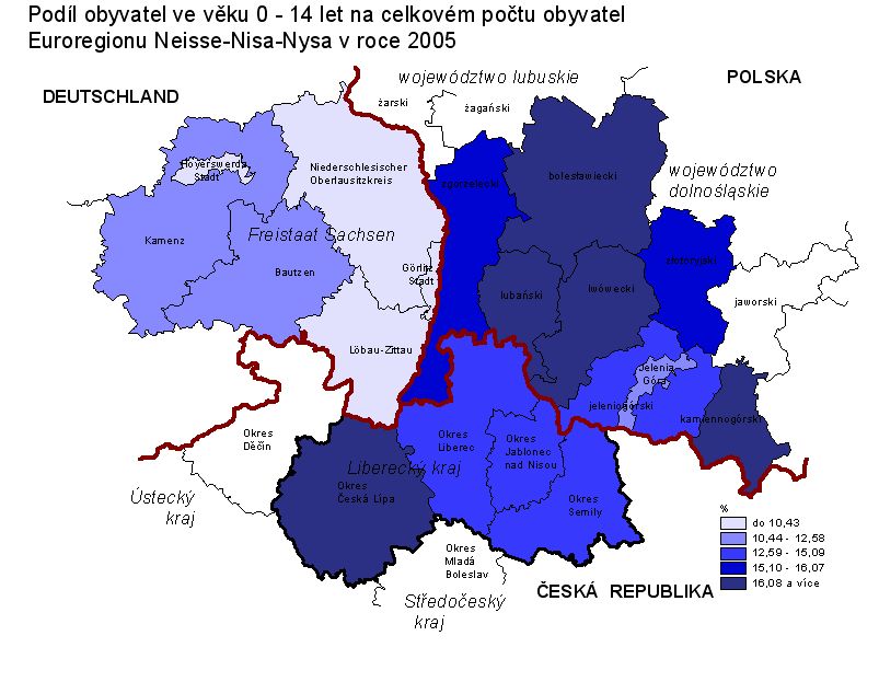 Podíl dětí ve věku 0 - 14 let na celkovém počtu obyvatel Euroregionu Neisse-Nisa-Nysa |