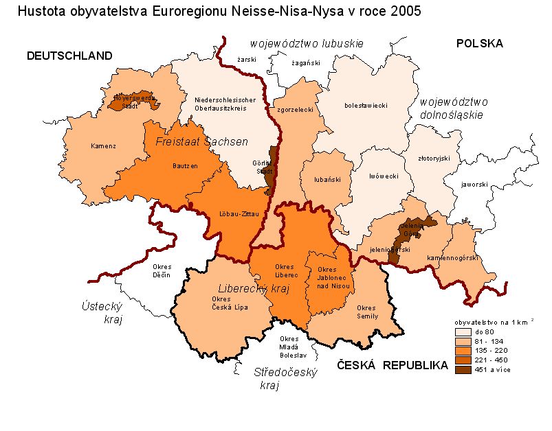 Hustota obyvatelstva Euroregionu Neisse-Nisa-Nysa v roce 2005 |