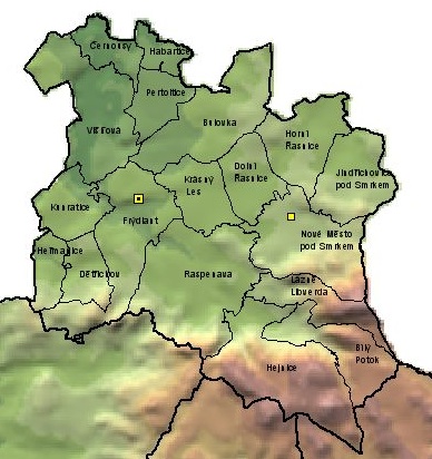 HISTORIE ÚZEMÍPrvní historické zmínky o většině sídel na území správního obvodu Frýdlant pocházejí ze 14. století – například Raspenava (1343), Višňová (1363), Kunratice (1377), Hejnice, Dětřichov, Jindřichovice pod Smrkem (1381), Černousy (1385), Habartice (1399). Výjimkou je samotný Frýdlant, o kterém byla zaznamenána první zmínka již v roce 1278. Naopak o Novém Městě pod Smrkem a Bílém Potoce se poprvé psalo až v roce 1592, resp. 1597. HISTORIE MĚSTMěsto FRÝDLANT se rozkládá na obou březích řeky Smědé a tvoří přirozené centrum celého frýdlantského výběžku. Počátky osídlení zdejšího území však sahají již do 6. století našeho letopočtu. Frýdlantem vedla důležitá zemská stezka, proto byla na čedičové skále postavena strážní věž, zvaná Indica, která byla později přestavěna na hrad. Existence hradu je písemně doložena v roce 1278, kdy zdejší panství koupil od českého krále Přemysla Otakara II. Rudolf z Bibersteinů. Obyvatelstvo se usazovalo na březích řeky Smědé a dalo také základ budoucímu městu, jehož rozvoj nastal ve 14. století za Bibersteinů, kteří zdejší osadu povýšili na město přidělením městských privilegií. V 19. století Frýdlant, i přes rozvoj především textilního průmyslu, začal zaostávat za Libercem, který byl po celý středověk ve stínu Frýdlantu. HEJNICE – první písemná zmínka o tomto sídle pochází z roku 1381. Existence Hejnic však byla úzce spjata s poutním kostelem, jehož vznik dle pověsti spadá již do roku 1211. Toto místo se stalo známým také díky řádu františkánů, kterým zde roku 1692 hrabě František Gallas založil klášter. V 16. století byly na území Hejnic otevřeny doly na železnou rudu a v 19. století vyrostlo v obci i v jejím okolí několik textilních továren. Tradice této výroby se zde udržela i do nynějších časů. Obec Hejnice byla dne 31. 7. 1917 povýšena na město. NOVÉ MĚSTO POD SMRKEM – vznik města úzce souvisí s těžbou cínu a dalších barevných kovů v okolí. Založeno bylo Melchiorem z Redernu roku 1584 jako Nové České město (Böhmisch Newstatt). Již v roce 1592 mu zakladatel udělil horní a hrdelní právo, právo týdenního trhu a některé další výsady mezi nimi i městský znak. Další výhody byly poskytovány horníkům, kteří se zde usadili – osvobození od daní a vojenské povinnosti, možnost svobodného odchodu z města a jiné. Město bylo postaveno v krátké době a podle jednotného plánu, jak o tom svědčí jeho pravoúhlé ulice i náměstí. Svým půdorysem se podobá jiným horním městečkům, např. v Krušných horách. RASPENAVA – je v historických pramenech uvedena již roku 1343. První osídlenci sem přicházeli z Lužice a obec se rozkládala pouze na levém břehu Smědé, původně měla lužickosrbské pojmenování Wietew. V roce 1962 došlo ke spojení se dvěma sousedními obcemi Luhem, Lužcem a osadou Peklo, čímž vzniklo dnešní město Raspenava. Dříve zemědělský charakter obce poměrně brzy ovlivnila těžba a také zpracování nerostných surovin, již od roku 1512 zde stál hamr a železárna zpracovávající nejen místní, ale i dováženou rudu. Významná byla i vápenka na Vápenném vrchu, který je význačnou geologickou lokalitou. Správní obvod obce s rozšířenou působností Frýdlant se nachází v nejsevernější části Libereckého kraje v tzv. Frýdlantském výběžku. Ze tří stran (západ, sever a východ) hraničí s Polskem a na jižní straně jsou jeho sousedy správní obvody obcí s rozšířenou působností Liberec, Jablonec nad Nisou a Tanvald. Oblast Frýdlantského výběžku je zařazena do Žitavského bioregionu, který tvoří mírná pahorkatina zasahující až pod Jizerské hory, jejichž část se rozkládá v jižní části správního obvodu. Zde se také nachází nejvyšší hora Jizerských hor Smrk (1 124 m n. m.). V chráněné krajinné oblasti Jizerské hory najdeme řadu maloplošných přírodních rezervací a památek. Typickým pro toto území jsou četné bučiny a rašeliniště. Celým územím správního obvodu napříč protéká řeka Smědá, kolem které se vyskytuje mnoho vzácných a ohrožených živočichů. Významnými lesními komplexy jsou Poustecká obora s několika lesními rybníky a oblast v okolí vrchu Chlumu, vyhlášená jako Přírodní park Peklo. Poněkud odlišnou faunu lze nalézt v opuštěné části pískoven v okolí Horní Řasnice. Rozlohou 34 901 hektarů je správní obvod Frýdlant třetím největším a zároveň nejméně zalidněným správním obvodem (70,3 obyvatel na km2). Zaujímá 11,0 % celkové rozlohy kraje. Na území správního obvodu Frýdlant se nachází 18 obcí, z toho čtyři se statutem města (Frýdlant, Hejnice, Nové Město pod Smrkem, Raspenava). Území je rozděleno do 34 katastrů. Zemědělská půda představuje 45,3 % celkové rozlohy správního obvodu, nezemědělskou půdu tvoří především lesní pozemky (47,6 % výměry území). Nejníže položenou obcí na území frýdlantského správního obvodu je Višňová, a to v nadmořské výšce 228 m, nejvýše je pak položeno Nové Město pod Smrkem (465 m n. m.) VeOsprávním obvodu Frýdlant ke konci roku 2006 žilo celkem 24 545 obyvatel, tj. 5,7 % obyvatel Libereckého kraje. V průběhu roku 2006 se zde živě narodilo celkem 265 dětí, z toho 128 dětí (48,3 %) se narodilo mimo manželství. Nejvíce dětí, a to 137, se narodilo matkám vdaným (51,7 %), ale významný podíl 41,9 % narozených dětí připadl rovněž na svobodné matky. Průměrný věk matky při narození dítěte dosáhl 28,0 let a byl tak nejnižší z deseti správních obvodů Libereckého kraje. Ve sledovaném roce zemřelo celkem 215 osob, byl tak dosažen kladný přirozený přírůstek obyvatel ve výši 