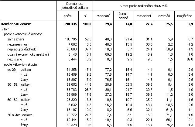 Změny v zastoupení mužů a žen bezpochyby souvisí i se změnami ve složení podle rodinného stavu. Z celkového počtu 201 335 domácností jednotlivců je 29,4% svobodných osob, následují domácnosti rozvedených osob, kterých bylo 27,4%, ovdovělých je 25,5%, domácností jednotlivých ženatých mužů a vdaných žen je necelých 15%. Oproti roku 1991 se téměř o třetinu zvýšil počet domácností svobodných osob, domácností rozvedených osob je více o 10,8%, ženatých nebo vdaných o necelých 7% a naopak domácností ovdovělých osob je o 18,4% méně. To, že celkem 29 769 vdaných žen a ženatých mužů nebydlí se svým partnerem resp. nemají s ním společný trvalý pobyt a jsou domácnostmi jednotlivců, nevypovídá jen o situaci v bydlení, ale patrně i o faktickém rozpadu manželství, která sice formálně existují, ale ve skutečnosti zanikla.