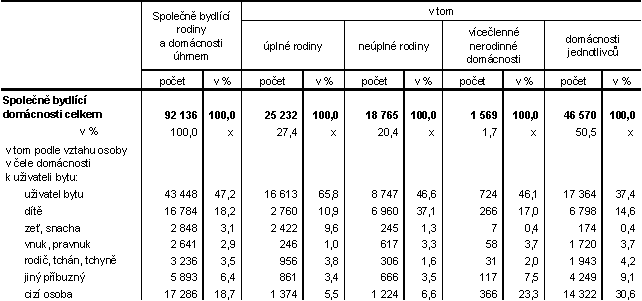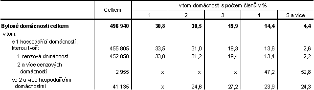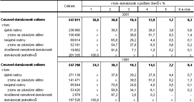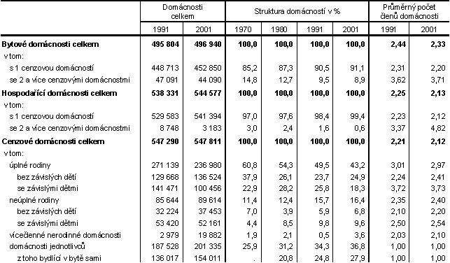Ve složení bytových domácností podle počtu cenzových domácností došlo k následujícím změnám. Počet bytových domácností, které tvoří jedna cenzová domácnost, dosáhl 452 850 (tj.91,1% všech bytových domácností), zbývajících 44 090 (tj. necelých 9%) bytových domácností je tvořeno dvěma a více cenzovými domácnostmi. V roce 1970 bylo takovýchto domácností ještě skoro 15%. Struktura bytových domácností podle počtu členů doznala proti roku 1991 rovněž změny. Zvýšil se počet domácností jednotlivců (o více než 17 tisíc), nepatrně vzrostl počet domácností se dvěma členy, domácností se třemi a více členy naopak ubylo. Snížení počtu vícečlenných domácností souvisí jak s poklesem počtu domácností, v nichž probíhá soužití více cenzových domácností v jednom bytě, tak s absolutním snížením počtu členů jedné domácnosti. Vícečlenné rodinné domácnosti se stávají stále více výjimečnými.