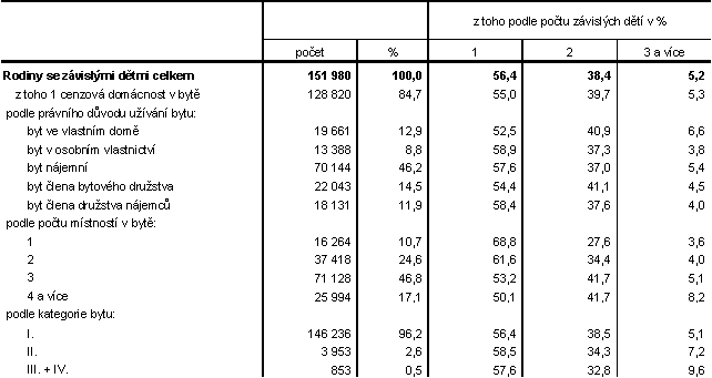Další zajímavou informaci, kterou sčítání 2001 poskytlo, je informace o bydlení rodin se závislými dětmi (dále jen dětmi). Naprostá většina z celkového počtu rodin s dětmi bydlí v bytě, z nich pak 85% bydlí v bytě samostatně, tedy bez další rodiny či jednotlivce. Většina rodin s dětmi bydlí v bytě nájemním (46,2%), ve vlastním domě nebo v bytě v osobním vlastnictví bydlí více než čtvrtina rodin, v družstevním bytě necelých 15% a v bytě člena družstva nájemců 12%. Tyto podíly se nijak výrazně neodlišují od údajů o bydlení cenzových domácností jako celku. Obdobně jako u bydlení cenzových domácností je i u bydlení rodin s dětmi zřejmé, že naprostá většina jich bydlí v bytě I. kategorie, minimálně (0,5%) v bytech III. a IV. kategorie. Více než polovina z celkového počtu rodin s dětmi, které bydlí v bytech I. kategorie jsou rodiny s jedním dítětem, skoro 40% je rodin se dvěma dětmi a jen 5% rodin je se třemi a více dětmi. Podobná struktura v bydlení rodin je i u bytů II. kategorie, v bytech III. a IV. kategorie bydlí jen půl procenta celkového počtu rodin s dětmi.