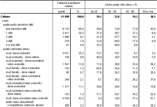 Soubor úplných rodinných domácností zahrnuje kromě manželských dvojic s dětmi či bez dětí také tzv. faktická manželství druhů a družek. Z celkového počtu 236 980 úplných rodin bylo takovýchto faktických manželství 11 890 (tj. 5%). Proti roku 1991 se absolutní počet faktických manželství zvýšil o 3 870, změnila se struktura podle počtu dětí, věku, rodinného stavu i vzdělání partnerů.