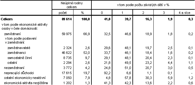 Obdobně jako v úplných rodinách převažují v neúplných rodinách rodiny, v jejichž čele stojí zaměstnaná osoba, zpravidla zaměstnanec. Neúplných rodin v jejichž čele stojí nepracující důchodce, je necelá jedna pětina z celkového počtu a jedná se převážně o rodiny bez závislých dětí.