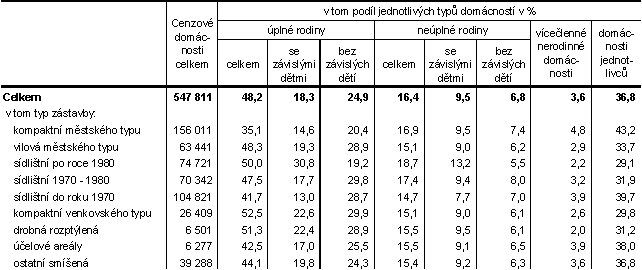 Podíváme-li se blíže na bydlení rodin a domácností podle typu domácností, je zřejmé, že v kompaktní zástavbě městského typu, tedy v centrálních částech Prahy, převládají domácnosti jednotlivců. Nadpoloviční většina úplných rodin je v kompaktní zástavbě venkovského typu, dále v sídlištní zástavbě postavené po roce 1980 a také v drobné rozptýlené zástavbě. V sídlištní zástavbě z let po roce 1970 je vysoký podíl neúplných rodin. Dále např. vidíme, že z celkového počtu rodin, které bydlí v sídlištích postavených do roku 1970, je přes 40% úplných rodin, v nich pak převažují úplné rodiny bez závislých dětí a dále domácností jednotlivců, kterých je skoro 40%. Podobná situace je i v sídlištní zástavbě z let 1970-1980. Z toho lze usuzovat, že v těchto lokalitách bydlí spíše obyvatelstvo starší, a že ve značné části bytů zde patrně z původní rodiny zůstali po odchodu dětí již jen rodiče nebo jen jeden z rodičů. V sídlištích postavených po roce 1980 je situace poněkud jiná. Z celkového počtu 74,7 tis. cenzových domácností je skoro 68,7% rodinných domácností a z nich je 64,0% rodin se závislými dětmi. Jde tedy spíše o mladší obyvatelstvo, u něhož je stále převaha rodin s dětmi obvyklá. Domácností jednotlivců je zde 29%, což je nejnižší podíl ze všech typů zástavby.