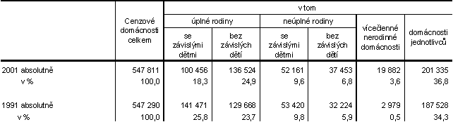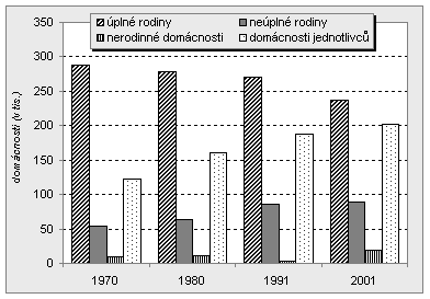 Za uplynulých deset let (období 1991-2001) úplných rodinných domácností (právních manželství nebo tzv. faktických manželství) ubylo celkem více než 34 tisíc, zvýšil se počet neúplných rodin o necelé tři tisíce, ale zejména počet domácností jednotlivců (o 13 807). Výrazné zvýšení počtu vícečlenných nerodinných domácností (o 16 903) je dáno do značné míry metodickou změnou v posuzování soužití prarodiče s vnoučetem. V roce 1991 bylo takovéto soužití posuzováno jako neúplná rodina, v roce 2001 jako vícečlenná nerodinná domácnost. Z úplných rodin nejvíce ubylo rodin se závislými dětmi (skoro o 30%), úplných rodin bez závislých dětí je naopak více (skoro o 6%). Ubylo rovněž neúplných rodin se závislými dětmi, neúplných rodin bez závislých dětí je o 16% více.