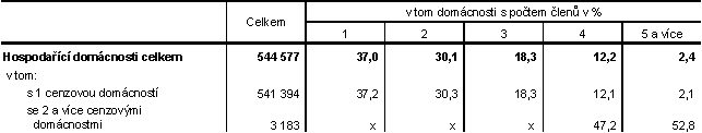 Převážná většina hospodařících domácností je složena z jedné cenzové domácnosti, jen 3 183 hospodařících domácností je složeno ze dvou a více cenzových domácností. To znamená, že se společné hospodaření stejně jako společné bydlení cenzových domácností postupně stává spíše výjimkou. Zatímco v roce 1991 připadalo na 100 hospodařících domácností 101,7 cenzových, v roce 2001 to bylo již jen 100,6. Srovnání základních údajů o složení hospodařících domácností podle počtu cenzových za Prahu a velká města ČR nevykazuje téměř žádné odlišnosti - podíl hospodařících domácností s jednou cenzovou domácností je v Praze 99,4%, v Brně 99,1%, v Ostravě a Plzni shodně 99,5%.