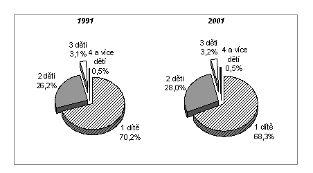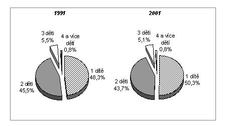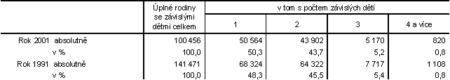 Z porovnání s rokem 1991 je zřejmé, že se do roku 2001 snížil nejen celkový počet úplných rodin, ale zejména počet úplných rodin s dětmi, z nich pak nejvíce ubylo rodin se dvěma dětmi (o 20 420). Rodin s jedním dítětem je o 17 760 méně, rodin se třemi a čtyřmi dětmi o 2 835 méně.