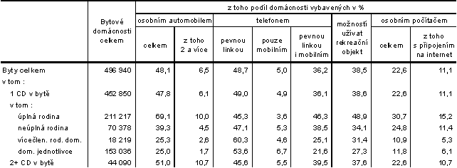 Téměř každá druhá domácnost má automobil a pevnou telefonní linku, mobilní i pevnou telefonní linku má více než třetina domácností, možnost využívat rekreační objekt má necelých 40% domácností a osobním počítačem je vybavena více než třetina domácností. V průměru jsou lépe vybaveny domácnosti se dvěma a více cenzovými domácnostmi v bytě než domácnosti s jednou cenzovou domácností. Z bytových domácností tvořených jednou cenzovou domácností (je jich 91,1% z celkového počtu bytových domácností) jsou lépe vybaveny úplné rodiny, než ostatní typy cenzových domácností. Z úplných rodin jsou s výjimkou možnosti využívat rekreační objekt lépe vybaveny rodiny s dětmi. Vybavení neúplných rodin je relativně nižší než u rodin úplných.
