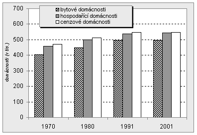 Změnila se velikost domácností co do počtu členů - průměrný počet členů domácnosti se ve všech typech snížil. Nejmenší jsou domácnosti cenzové (v průměru mají 2,12 členů), domácnosti hospodařící mají 2,13 členů, průměrná velikost bytové domácnosti je 2,33 členů. Pozitivní je skutečnost, že se opět zvýšil podíl domácností, které žijí a hospodaří samostatně - z celkového počtu bytových domácností jich bylo 91,1%, z počtu hospodařících domácností 99%.