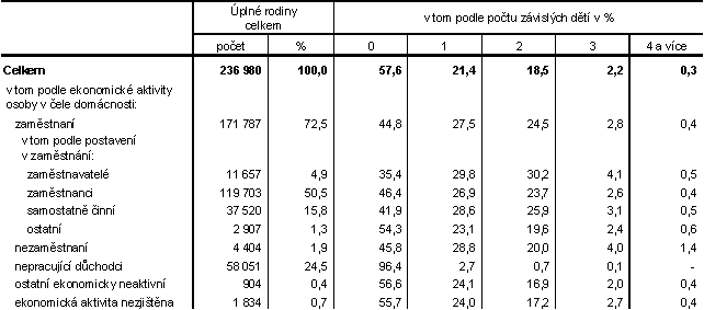 Tab. 5.4.3 Úplné rodiny podle počtu závislých dětí a ekonomického postavení osoby v čele domácnosti - 2001