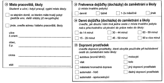 o přesunu z místa trvalého bydliště do místa pracoviště nebo školy (otázka na místo pracoviště, školy a otázka na frekvenci dojížďky (docházky) do zaměstnání a školy)