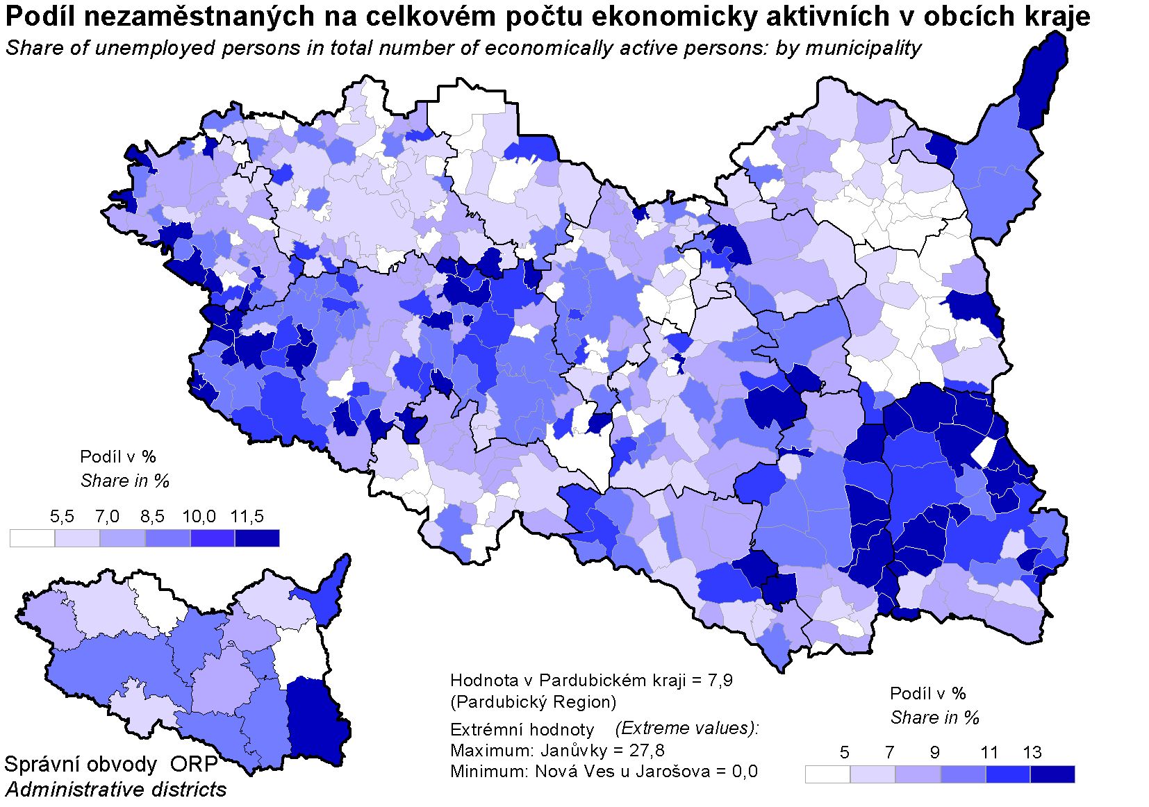 35. Podíl nezaměstnaných na celkovém počtu ekonomicky aktivních v obcích kraje / 35. Share of unemployed persons in total number of economically active persons: by municipality