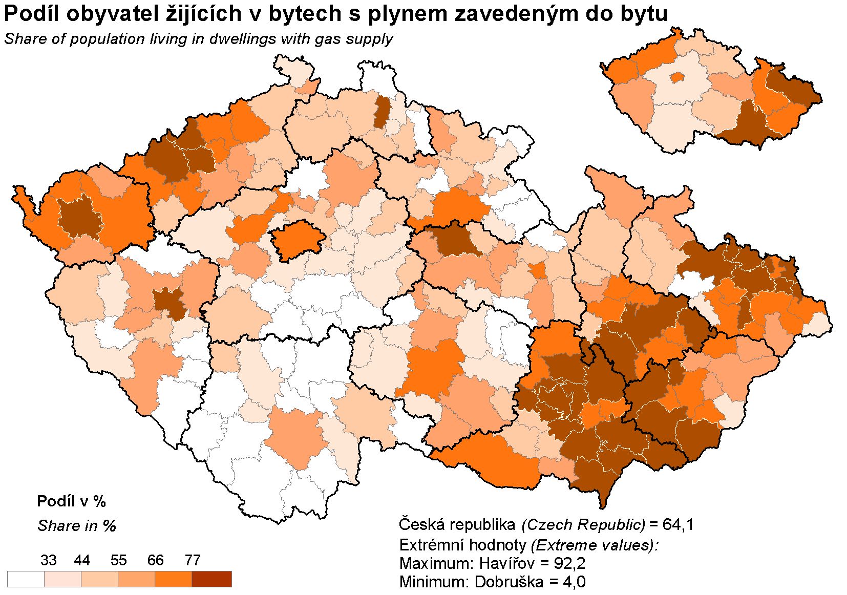 22. Podíl obyvatel žijících v bytech s plynem zavedeným do bytu podle krajů a správních obvodů obcí s rozšířenou působností / 22. Share of population living in dwellings with gas supply: by region and district of municipalities with extended competen