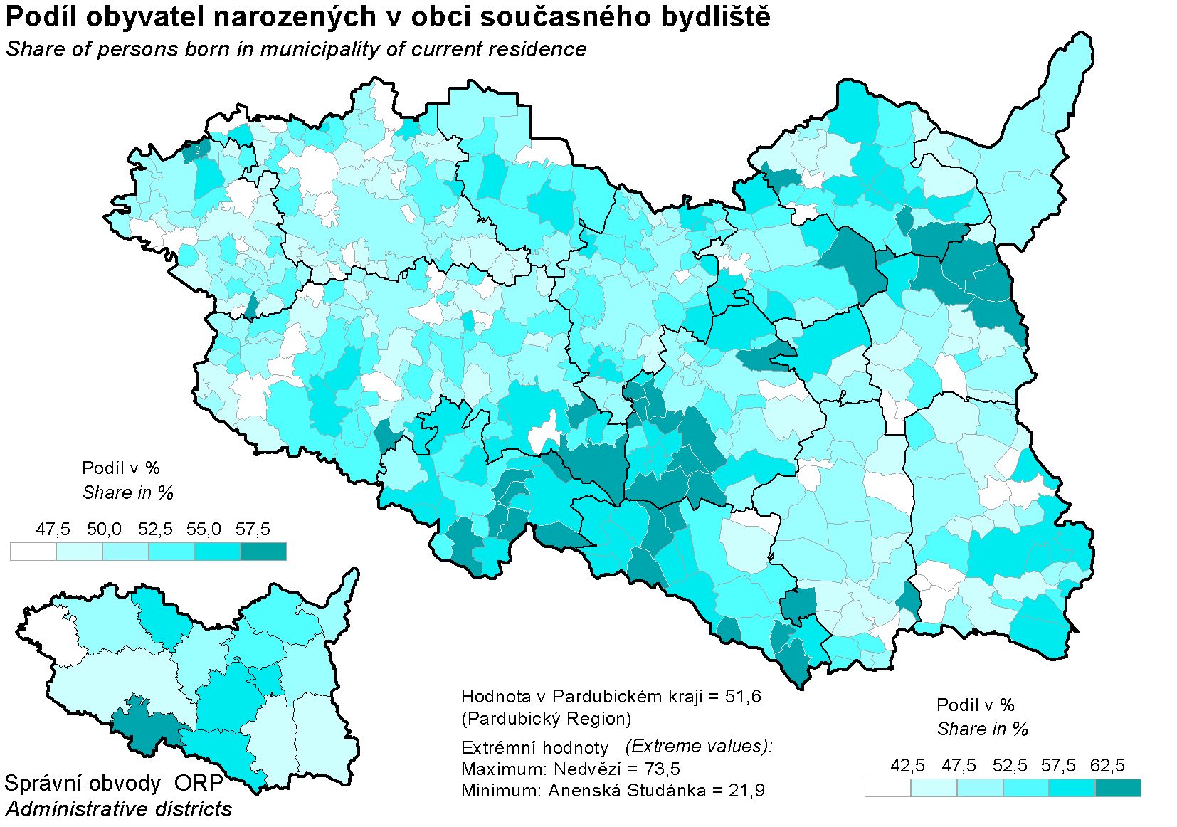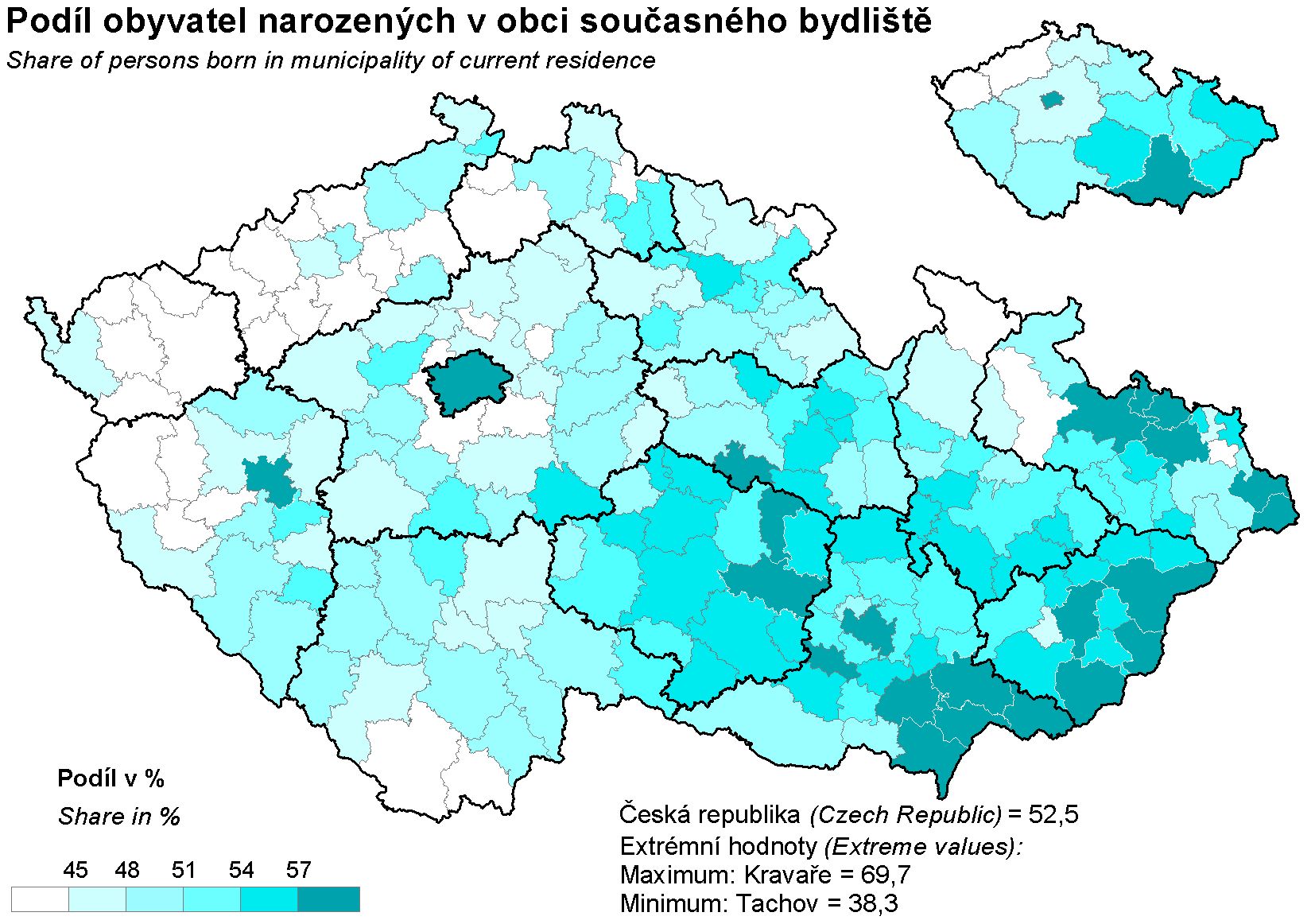 8. Podíl obyvatel narozených v obci současného bydliště podle krajů a správních obvodů obcí s rozšířenou působností / 8. Share of persons born in municipality of current residence: by region and district of municipalities with extended competence