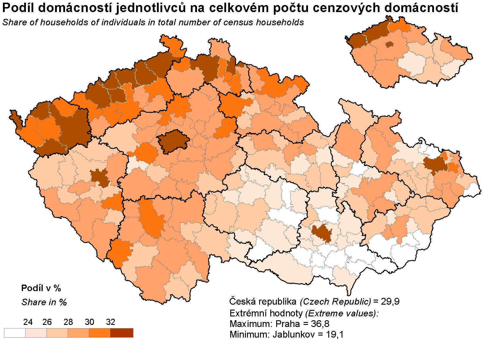 20. Podíl domácností jednotlivců na celkovém počtu cenzových domácností podle krajů a správních obvodů obcí s rozšířenou působností / 20. Share of households of individuals in total number of census households: by region and district of municipalitie