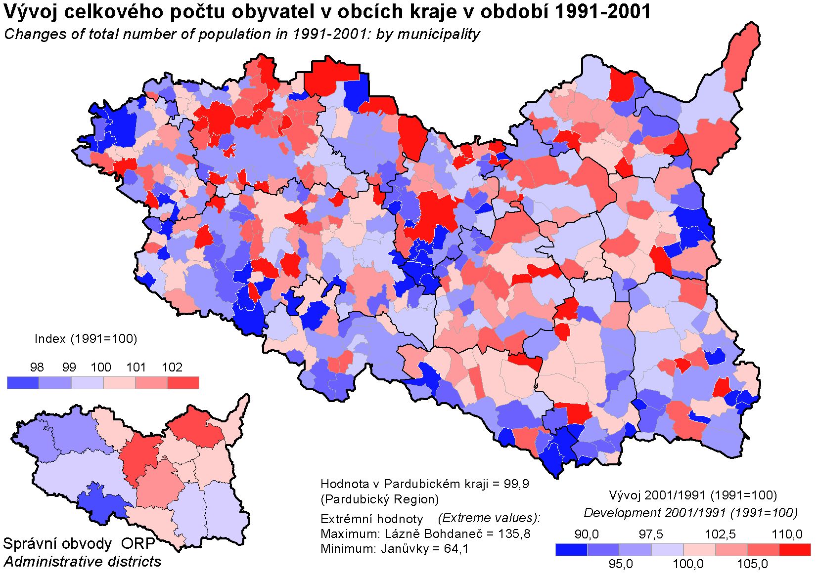 29. Vývoj celkového počtu obyvatel v obcích kraje v období 1991 - 2001 / 29. Changes of total number of population in 1991 - 2001: by municipality