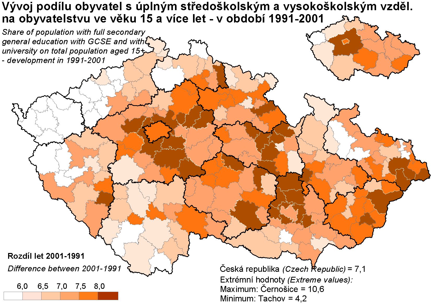9. Vývoj podílu obyvatel s úplným středoškolským a vysokoškolským vzděláním na obyvatelstvu ve věku 15 a více let v období 1991 - 2001 podle krajů a správních obvodů obcí s rozšířenou působností / 9. Share of population with full secondary general ed