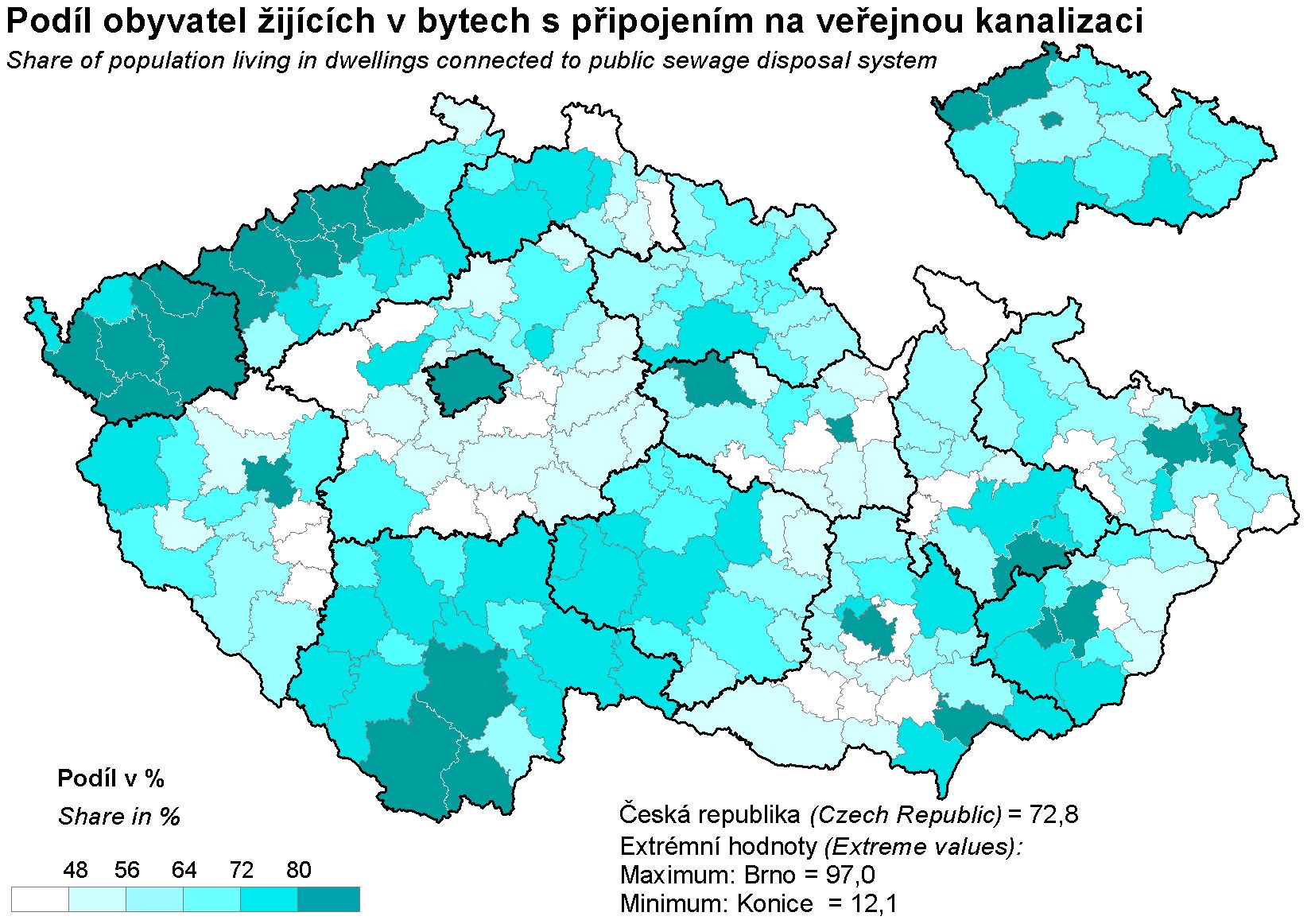 24. Podíl obyvatel žijících v bytech s připojením na veřejnou kanalizaci podle krajů a správních obvodů obcí s rozšířenou působností / 24. Share of population living in dwellings connected to public sewage disposal system: by region and district of m