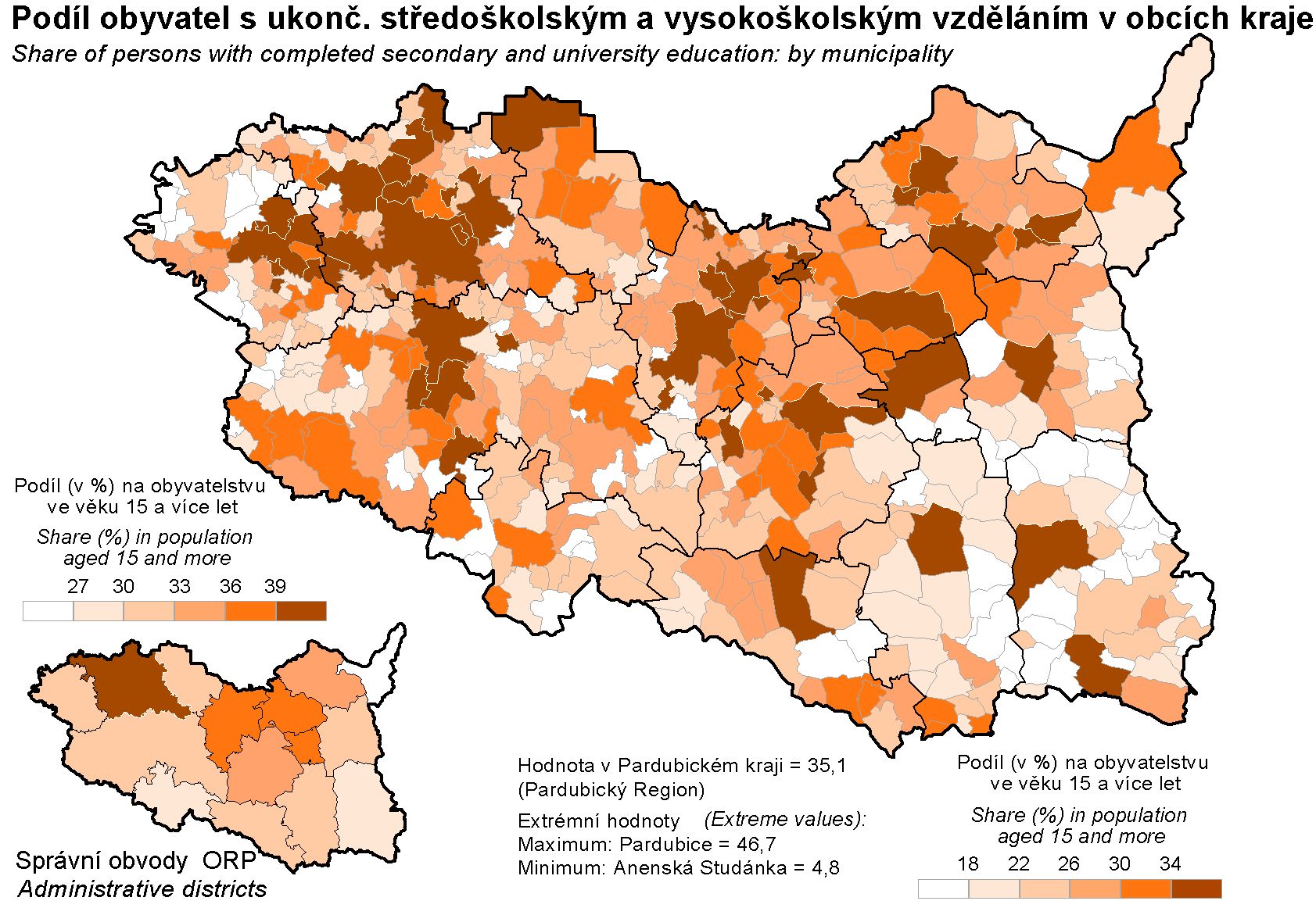 33. Podíl obyvatel s ukončeným středoškolským a vysokoškolským vzděláním v obcích kraje / 33. Share of persons with completed secondary and university education: by municipality