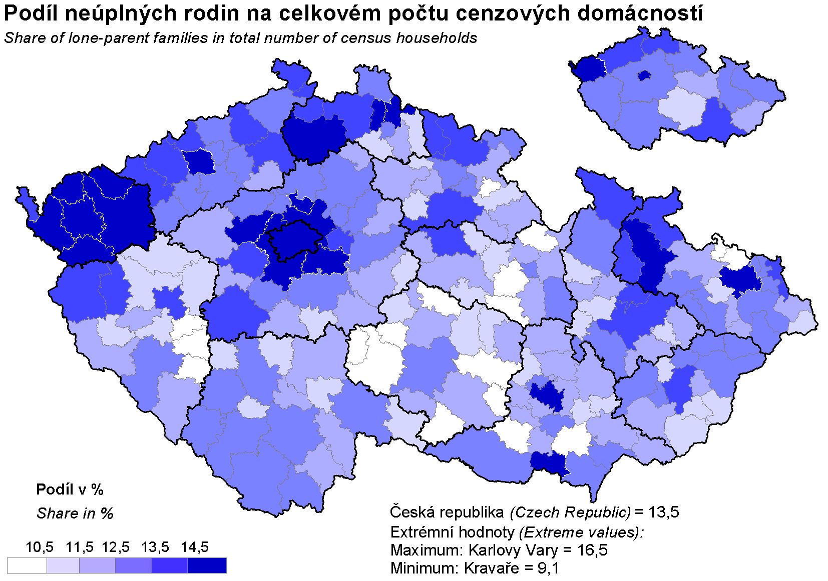 19. Podíl neúplných rodin na celkovém počtu cenzových domácností podle krajů a správních obvodů obcí s rozšířenou působností / 19. Share of lone-parent families in total number of census households: by region and district of municipalities with exten