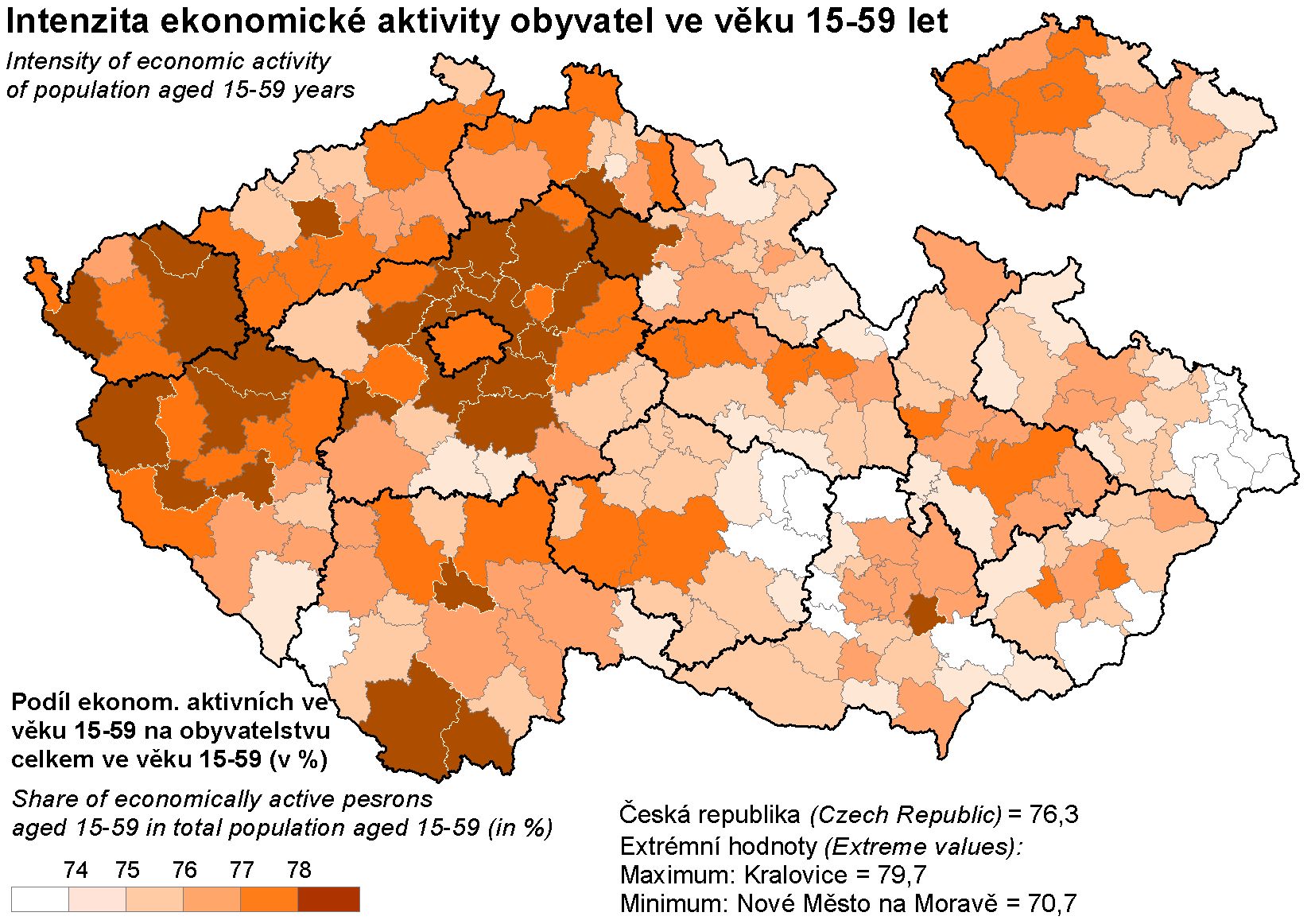 11. Intenzita ekonomické aktivity obyvatel ve věku 15 - 59 let podle krajů a správních obvodů obcí s rozšířenou působností / 11. Intensity of economic activity of population aged 15 - 59 years: by region and district of municipalities with extended c