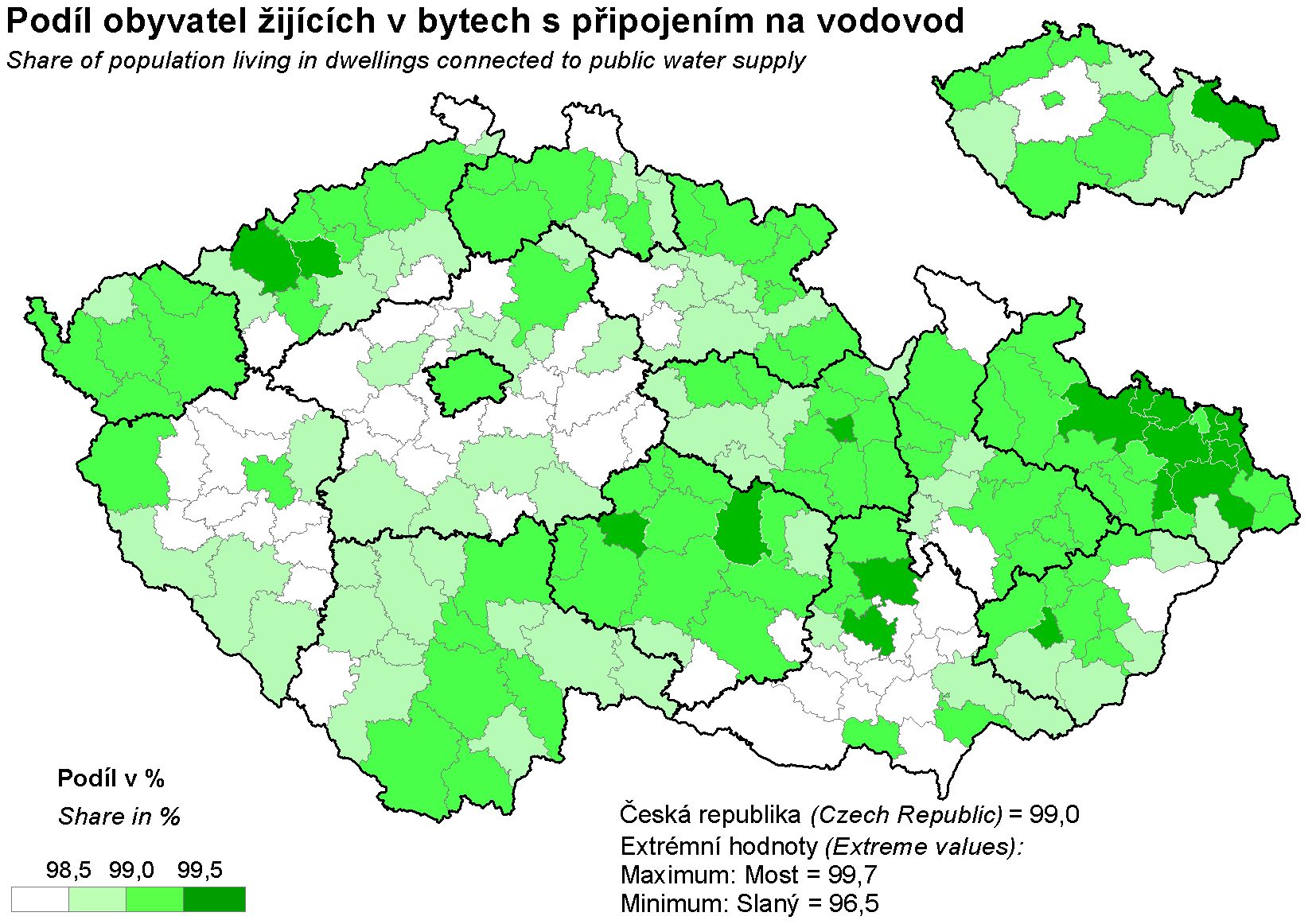 23. Podíl obyvatel žijících v bytech s připojením na vodovod podle krajů a správních obvodů obcí s rozšířenou působností / 23. Share of population living in dwellings connected to public water supply: by region and district of municipalities with ext