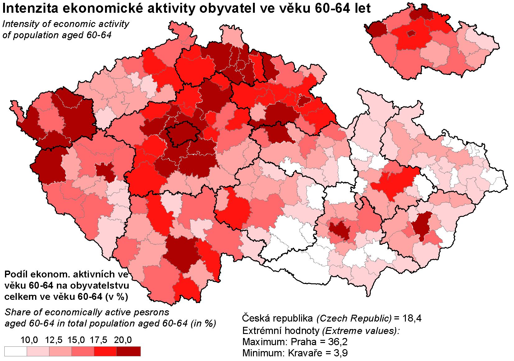 12. Intenzita ekonomické aktivity obyvatel ve věku 60 - 64 let podle krajů a správních obvodů obcí s rozšířenou působností / 12. Intensity of economic activity of population aged 60 - 64 years:by region and district of municipalities with extended co