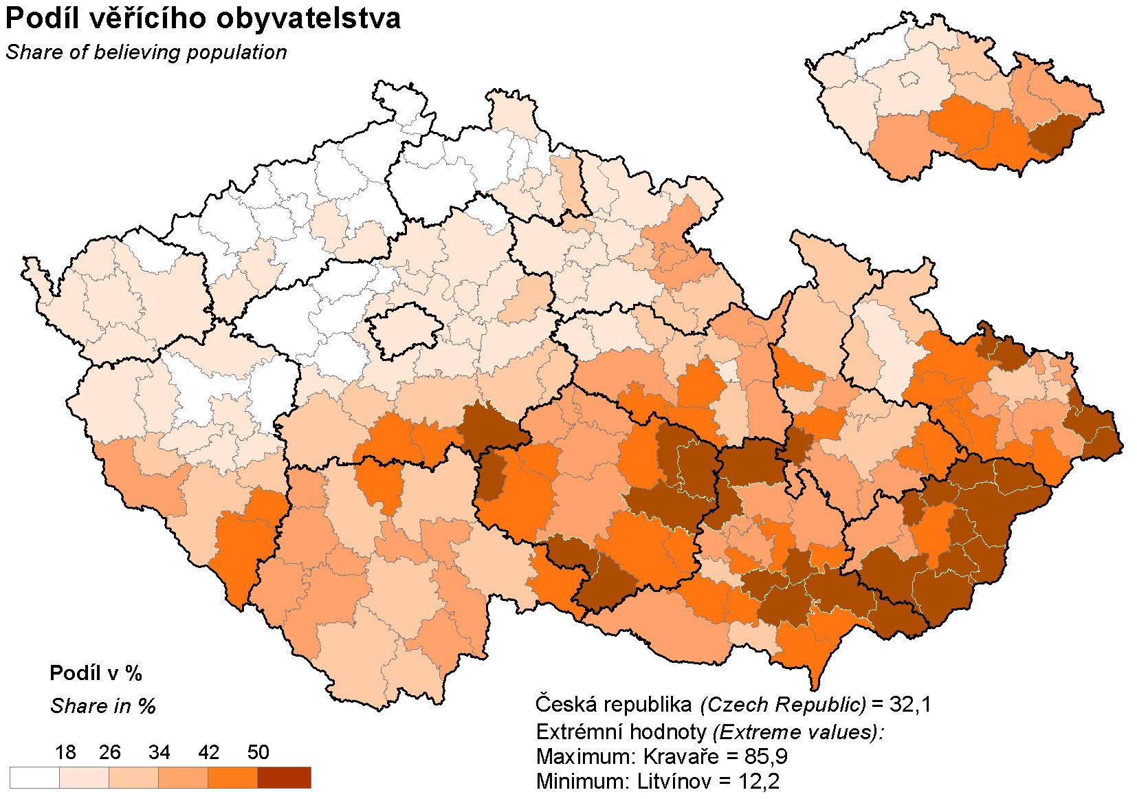 17. Podíl věřícího obyvatelstva podle krajů a správních obvodů obcí s rozšířenou působností / 17. Share of believing population: by region and district of municipalities with extended competence