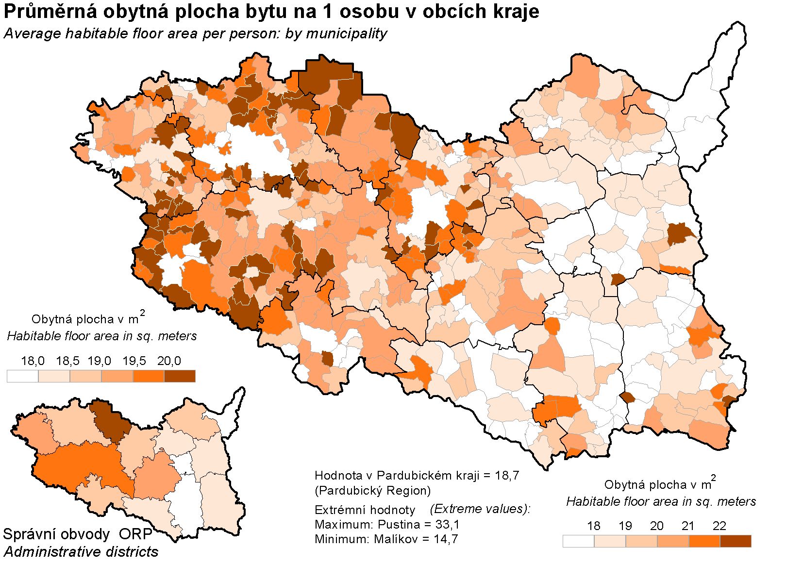 26. Průměrná obytná plocha bytu na 1 osobu podle krajů a správních obvodů obcí s rozšířenou působností / 26. Average habitable floor area per person: by region and district of municipalities with extended competence