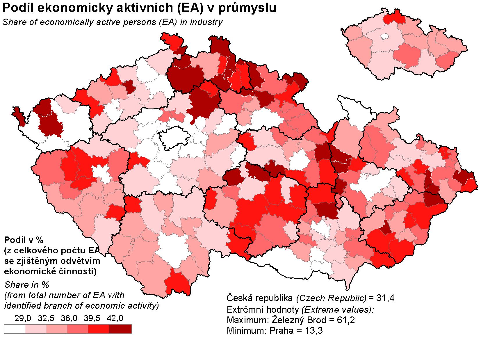 14. Podíl ekonomicky aktivních v průmyslu podle krajů a správních obvodů obcí s rozšířenou působností / 14. Share of economically active persons in industry: by region and district of municipalities with extended competence