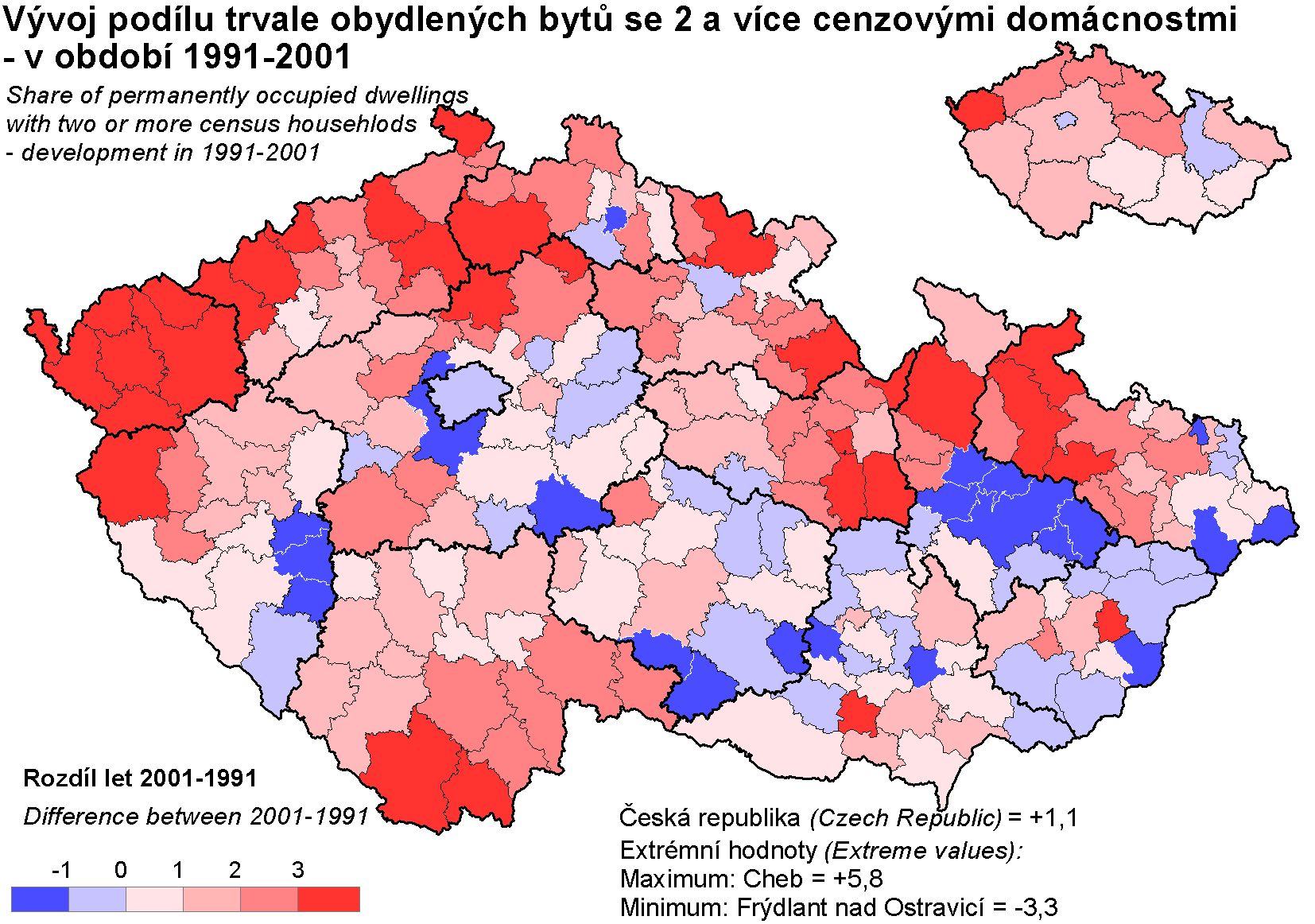 27. Vývoj podílu trvale obydlených bytů se 2 a více cenzovými domácnostmi na celkovém počtu trvale obydlených bytů podle krajů a správních obvodů obcí s rozšířenou působností v období 1991 - 2001 / 27. Share of permanently occupied dwellings with two