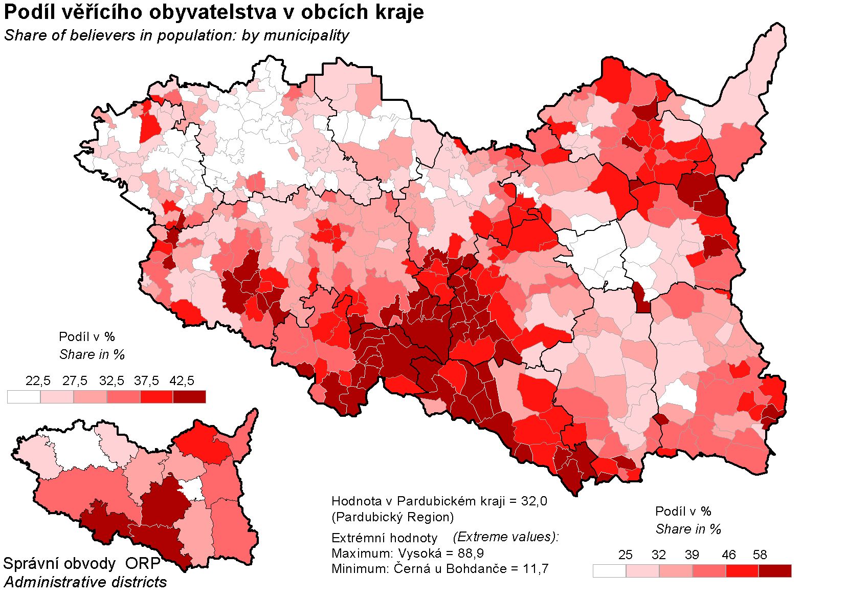 32. Podíl věřícího obyvatelstva v obcích kraje / 32. Share of believers in population: by municipality