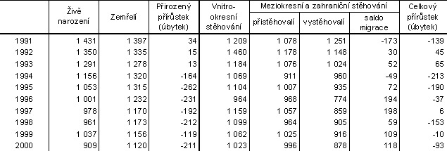 V průběhu 80. let se již začal projevovat pozvolný úbytek obyvatel, který pokračoval i během 90. let. Neustále se snižující počet živě narozených dětí a od roku 1994 trvalý úbytek obyvatel přirozenou měnou (živě narození mínus zemřelí) se na tomto vývoji podílely především. V uplynulých deseti letech převážně kladné migrační saldo (přistěhovalí mínus vystěhovalí) tento klesající trend dokázalo jen částečně zmírnit.