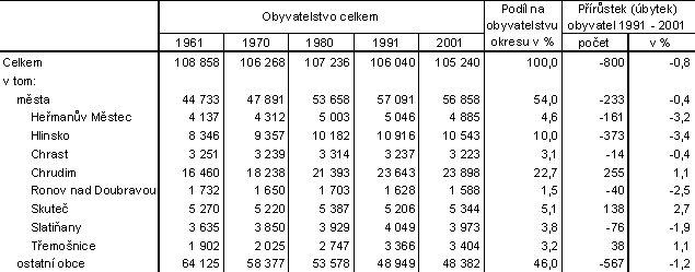 Počet obyvatel ve městech (přepočtený na současnou územní strukturu osmi měst) se oproti roku 1991 snížil v součtu o 233, u ostatních obcí o 567. K úbytku došlo celkem v 66 obcích, z toho v pěti městech (kromě Chrudimi, Skutče a Třemošnice). Největší absolutní úbytek obyvatel mezi obcemi okresu byl zaznamenán ve městech Hlinsko (373 osob) a Heřmanův Městec (161 osob). Více než 50 osob ubylo ještě v Horním Bradle, Hrochově Týnci, Slatiňanech, Seči, Včelákově a Vrbatově Kostelci. V relativním vyjádření byl nejvýraznější pokles počtu obyvatel v obci Žlebské Chvalovice (23,5 %), Hluboká (17,6 %) a Horní Bradlo (16,9 %). V dalších dvanácti obcích ubylo více než 10 % obyvatel.
