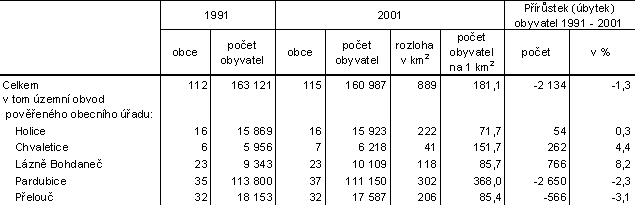Od 1. 1. 2003 byly navíc vymezeny územní obvody obcí s rozšířenou působností (ORP), kterými jsou města Pardubice, Přelouč a Holice. Obce Radhošť a Týnišťko ležící na území okresu Pardubice byly zařazeny pod ORP Vysoké Mýto z okresu Ústí nad Orlicí. Jak je patrné, obvody obcí s rozšířenou působností nejsou územně skladebné do hranic okresů. Jejich podrobná charakteristika z pohledu sčítání lidu je součástí krajské analytické publikace.