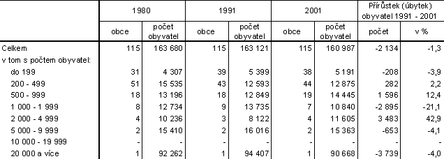 I po přepočtu je v 80. letech patrný nárůst počtu obcí i obyvatel v kategorii do 199 obyvatel a zcela opačný trend v kategorii 200 – 499 obyvatel. Příčiny tohoto jevu lze spatřovat ve stárnutí a vymírání obyvatel malých obcí, které nebylo kompenzováno příchodem mladých rodin. V následujících deseti letech již nedocházelo u obcí do 500 obyvatel k tak výrazným změnám; do velikostní skupiny 200 – 499 přešla v důsledku zvýšení počtu obyvatel pouze obec Jaroslav. V současné době je v této skupině zařazeno nejvíce obcí okresu – celkem 44 obcí, tj. 38,3 %. Na růstu podílu obyvatel ve velikostní skupině obcí s 500 – 999 obyvateli se podílel hlavně přesun obce Ostřetín ze skupiny 1 000 – 1 999.