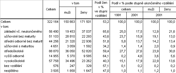 Vývoj za posledních deset let v oblasti vzdělání přesvědčivě vypovídá o růstu kvalifikovanosti obyvatel. V roce 2001 byli v populaci nejpočetnější skupinou obyvatelé se středním vzděláním s maturitou - jejich podíl činí 33,6%. Téměř 30% obyvatel má střední odborné vzdělání bez maturity (vč. vyučení). Ve struktuře této skupiny se projevily největší rozdíly za uplynulé desetiletí. Podíl učňovského vzdělání klesl z 23,7% v roce 1991 na 15,9% v roce 2001, proti tomu se výrazně zvýšil podíl obyvatel se středním odborným vzděláním bez maturity. V absolutních číslech odpovídá 18 117 obyvatelům s tímto vzděláním v roce 1991 plných 44 256 obyvatel se stejným vzděláním v roce 2001. Vysokoškolského vzdělání dosáhlo téměř 18% osob. O tom, že se úroveň vzdělání jednoznačně zvyšuje svědčí i to, že proti roku 1991 má podstatně méně obyvatel pouze základní vzdělání. Z hlediska pohlaví je vyšší podíl žen se základním vzděláním a úplným středním vzděláním s maturitou vč. nástavbového a vyššího odborného vzdělání.