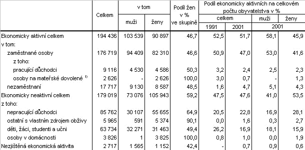 Údaj o počtu ekonomicky aktivních osob není plně srovnatelný na předchozí cenzy. Ve sčítání 1991 byly do počtu ekonomicky aktivních zahrnovány i ženy na tzv. další mateřské dovolené (do 3 let věku dítěte) a osoby pobírající mateřský příspěvek, pokud trval jejich pracovní poměr. V roce 2001 sem byly započítány jen ženy na mateřské dovolené v trvání 28 respektive 37 týdnů, ostatní jsou zahrnuty do ekonomicky neaktivních.