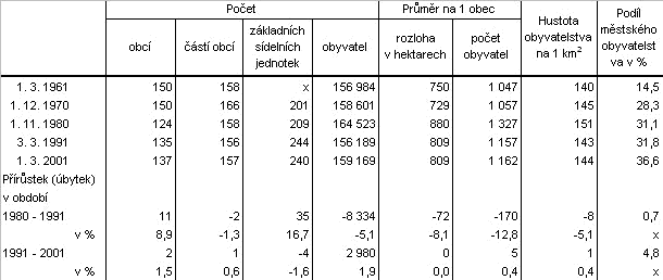 Průměrná rozloha obce zůstala stejná jako při sčítání v roce 1991 a činí 809 hektarů. Průměrný počet obyvatel na 1 obec se nepatrně zvýšil a dosáhl 1 162 osob. Více jak třetina všech obyvatel žije v obcích se statutem města, podíl městského obyvatelstva se za posledních deset let zvýšil o téměř 5 bodů.