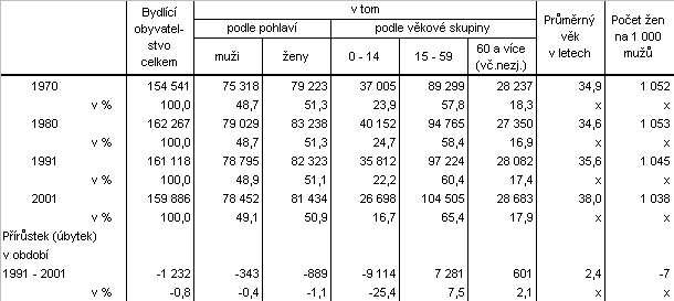 V průběhu uplynulých 10 let pokračoval trend z let osmdesátých, tj. projevovalo se dlouhodobé postupné stárnutí obyvatel. Snížil se podíl mladých lidí do 14 let na 16,7%, úbytek v období 1991 - 2001 činil 9 114 dětí, tj. 25,4%. Tím byla posílena skupina obyvatel produktivního věku na 65,4%, podíl populace starší 60 let zaznamenal pouze mírný přírůstek a představoval 17,9 % z celkového počtu obyvatel okresu.