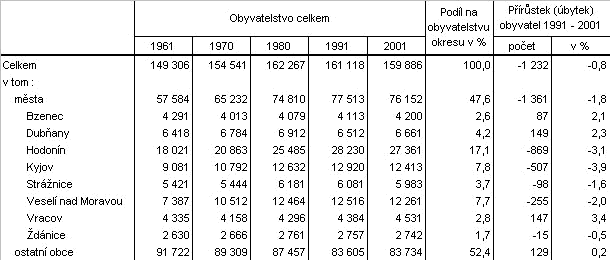 K největšímu snížení počtu obyvatel došlo převážně ve větších městech (Hodonín 869 osob, Kyjov 507 osob, Veselí nad Moravou 255 osob, Strážnice 98 osob). V kategori obcí do 1 000 obyvatel se největší snížení počtu obyvatel projevilo v Nové Lhotě (143 osob), Javorníku (129 osob, zde postupný úbytek obyvatel osady U Sabotů), Suchově (70 osob) a Vřesovicích (55 osob). Zvýšení počtu obyvatelstva se nejvíce projevilo v Lužicích (227 osob), Mutěnicích (170 osob), Rohatci (166 osob), Mikulčicích (155), Dubňanech (149 osob), Vracově (147 osob), Dolních Bojanovicích (103 osob) a Šardicích (81 osob).