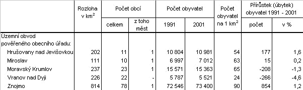 Pro srovnání velikosti obcí byly počty jejich obyvatel přepočteny na sídelní strukturu roku 2001. Zjevné je, že za posledních 10 let nedošlo k žádnému pohybu ve vyšších skupinách velikostní struktury, podstatný pohyb není zřetelný ani ve srovnání s rokem 1980. Do velikostní struktury nad 20 tisíc obyvatel v roce 2001 patří město Znojmo, do 10 tisíc obyvatel město Moravský Krumlov, do 5 tisíc obyvatel města Hrušovany nad Jevišovkou a Miroslav a obec Dobšice. V souhrnu se počet obyvatel v těchto 5 sídlech snížil proti roku 1991 o 159 osob.