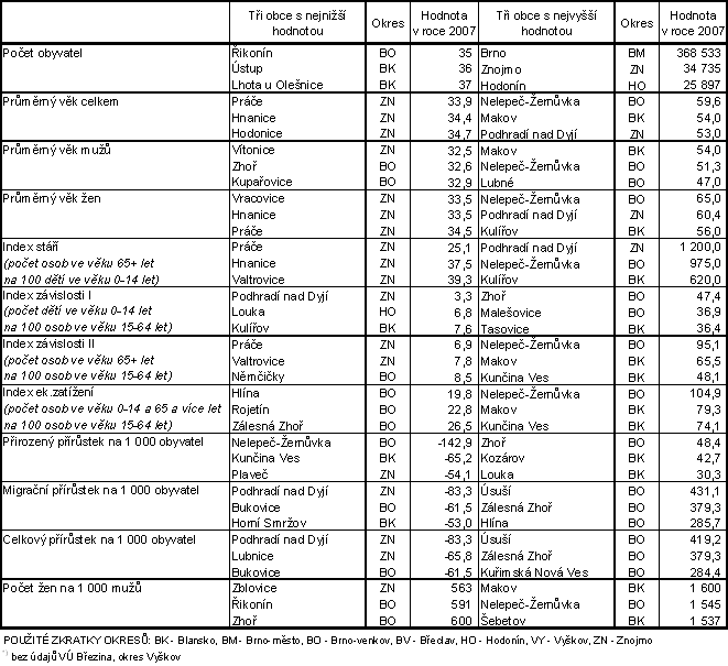 | K 31. prosinci 2007 žilo na území Jihomoravského kraje 1 140 534 obyvatel, proti konci roku 2006 se počet obyvatel zvýšil o 7 971 osob (o 0,7 %). Tento meziroční nárůst byl nejvyšší v porevoluční historii kraje, přesto však ještě nebylo dosaženo početního maxima, a to 1 149 203 obyvatel, kterého dosáhl Jihomoravský kraj v roce 1994. Od tohoto roku docházelo k postupnému snižování počtu obyvatel až na nejnižší hodnotu v roce 2002, kdy na území kraje žilo 1 128 820 obyvatel. Počet obyvatel se na konci roku 2007 zvýšil ve všech okresech Jihomoravského kraje s výjimkou okresu Hodonín. Zde došlo ke snížení počtu obyvatel o 115 osob (o 0,1 %), naopak k nejvyššímu nárůstu stavu obyvatel došlo v okrese Brno-venkov, zvýšení o 4 810 osob znamenalo nárůst 2,5 %. Na konci roku 2007 žilo v Jihomoravském kraji 555 338 mužů (48,7 %) a 585 196 žen (51,3 %), na 1 000 mužů tak připadalo 1 054 žen. Nejvyšší rozdíl v počtu mužů a žen se projevuje ve věkové skupině 65 a více let, zde bylo 38,9 % mužů a 61,1 % žen (na 1 000 mužů této věkové skupiny připadalo 1 573 žen). Z okresů kraje byl nejvyšší podíl žen v populaci okresu Brno-město, podíl 52,2 % žen znamenal, že na 1 000 mužů připadalo 1 094 žen. Dětská složka populace (věk 0 až 14 let) se ve všech okresech kraje vyznačovala vyšším podílem chlapců, ve skupině obyvatel v ekonomicky aktivním věku (15 až 64 let) byl vyšší podíl žen pouze v okrese Brno-město, v ostatních okresech v populaci této věkové skupiny převažovali muži. Stárnutí populace a snižování podílu dětské složky ve věkovém složení obyvatelstva je průvodním jevem populačního vývoje posledních let v celé naší společnosti. V Jihomoravském kraji na konci roku 2007 tvořila dětská složka 13,9 % obyvatel, obyvatelstvo v produktivním věku tvořilo 70,9 % celku a obyvatelstvo v poproduktivním věku 15,2 % z celkového počtu. Pro ilustraci vývoje lze uvést podíly jednotlivých věkových skupin v roce 1991 – podíl dětí tvořil 20,6%, podíl ekonomicky aktivních 66,0 % a v poproduktivním věku bylo 13,4 % obyvatel kraje. Z okresů kraje byl na konci roku 2007 nejvyšší podíl dětí z celku v okrese Brno-venkov (15,0 %), nejnižší v Brně-městě (12,8 %). Nejvyšší podíl obyvatel ve věku 15 až 64 let byl v okrese Břeclav (72,1 %), nejnižší v okrese Brno-venkov (70,3 %). Nejvyšší podíl obyvatel nejstarší věkové skupiny byl v Brně-městě (16,7 %), nejnižší pak v okrese Znojmo (13,7 %). Ze zastoupení 3 základních věkových skupin obyvatel kraje jsou konstruovány indexy stáří, závislosti či ekonomického zatížení. Hodnota indexu stáří 108,9 udává, že na 100 dětí připadlo 108,9 osob starších 65 let. Hodnota indexu závislosti I 19,7 udává, že na 100 obyvatel ve věku 15 až 64 let připadá 19,7 dětí, hodnota indexu závislosti II 21,4 udává, že na 100 obyvatel ve věku 15 až 64 let připadá 21,4 osob starších 65 let a konečně hodnota indexu ekonomického zatížení 41,1 udává, že na 100 obyvatel ve věku 15 až 64 let připadá 41,1 obyvatel v dětském věku a poproduktivním věku. Průměrný věk mužů v Jihomoravském kraji dosáhl v roce 2007 hranice 38,9 let, což bylo o 4,1 roku více než v roce 1991, průměrný věk žen se v roce 2007 ve srovnání s rokem 1991 zvýšil o 3,7 let a dosáhl hodnoty 42,2 let. Nejvyšší průměrný věk byl zjištěn v okrese Brno-město (muži 39,9 let, ženy 43,6 let), naopak nejmladší obyvatelstvo žilo na Znojemsku (38,1 let u mužů, 41,2 let u žen). V průběhu roku 2007 se v Jihomoravském kraji narodilo 12 401 dětí, živě se narodilo 12 371 dětí, mrtvě 30 dětí. Proti roku 2006 byl počet živě narozených dětí o 859 dětí vyšší a zároveň nejvyšší od roku 1994. Dlouhodobě se rodí více chlapců než dívek, v roce 2007 to bylo 6 312 chlapců a 6 059 děvčat. Pro porovnání porodnosti v okresech kraje je vhodné použít přepočet živě narozených na 1 000 obyvatel středního stavu (hrubá míra porodnosti). V tomto smyslu pak nejvyšší porodnost byla v okrese Brno-město (11,5 živě narozených na 1 000 obyvatel), nejnižší pak v okrese Břeclav (9,5 živě narozených na 1 000 obyvatel). Jen pro doplnění, 3 557 živě narozených dětí, tedy 28,8 % z celku, se narodilo mimo manželství. Nejvyšší podíl mimomanželsky narozených dětí byl zaznamenán v okrese Znojmo (32,3 %), naopak v okrese Brno-venkov jejich podíl činil jen 24,3 %. V Jihomoravském kraji v roce 2007 zemřelo 11 774 osob (5 859 mužů a 5 915 žen), což byl po letech 2004 a 2006 nejnižší počet od počátku devadesátých let. Situaci v okresech Jihomoravského kraje lze srovnat pomocí hrubé míry úmrtnosti, což je přepočet počtu zemřelých na 1 000 obyvatel středního stavu. Nejvyšší míra úmrtnost byla v okrese Brno-město (11,2 zemřelých na 1 000 obyvatel středního stavu), naopak nejnižší úroveň úmrtnosti byla v okresech Blansko a Brno-venkov, kde na 1 000 obyvatel středního stavu připadlo 9,7 zemřelých. Nejčastější příčinou úmrtí jsou již dlouhodobě nemoci oběhové soustavy, v roce 2007 byly příčinou 53,1 % úmrtí (u mužů byly příčinou 46,7 % všech úmrtí, u žen dokonce 59,5 %). Druhou nejčastější příčinou byly novotvary, tvořily celkově 24,8 % všech úmrtí (u mužů byly příčinou 28,0 % všech úmrtí, u žen 21,6 %). Spíše pro zajímavost lze uvést, že v roce 2007 spáchalo sebevraždu 101 mužů a 24 žen. Celkem 46 dětí zemřelo do jednoho roku, kojenecká úmrtnost, což je počet zemřelých do 1 roku na 1 000 živě narozených, tak v roce 2007 dosáhla hodnoty 3,7. Novorozenecká úmrtnost (počet zemřelých do 28 dnů na 1 000 živě narozených) měla hodnotu 3,1, když do 28 dnů po porodu zemřelo 38 dětí