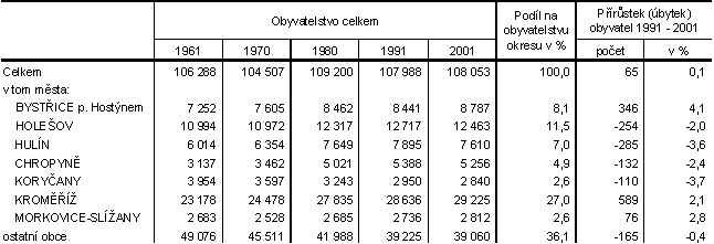 Od roku 1991 počet obyvatel vzrostl jen o 65 osob, ale přerušil se pokles z období let 1980 - 1991, který činil 1 212 osob. O něco více než celkový počet se zvýšil počet obyvatel žijících ve městech a to o 0,3 %. Tento nárůst je dlouhodobý, ovšem nejmenší od sčítání v roce 1961, a za posledních 10 let k němu došlo jen ve třech městech okresu. Největší absolutní přírůstek má okresní město Kroměříž, které se rozrostlo o 589 obyvatel. Relativní přírůstek je největší v Bystřici pod Hostýnem, kde v předchozích letech 1980 - 1991 naopak počet obyvatel poklesl o 0,7 %. V ostatních obcích okresu se stav obyvatel snížil a tento pokles je rovněž nejmenším poklesem od roku 1961.