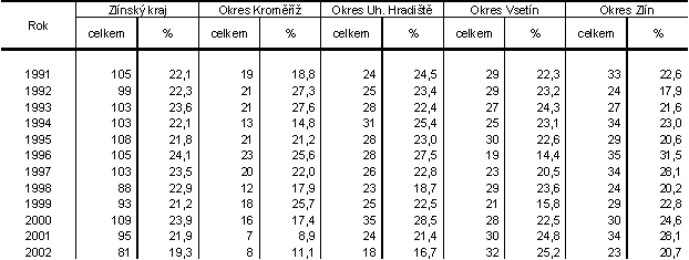 Tab. 26 Počet sebevražd a jejich podíl v úmrtích na vnější příčiny ve Zlínském kraji podle okresů za období 1991 – 2002