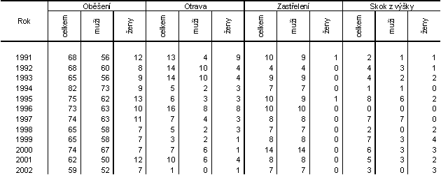 Tab. 27 Počet úmrtí na sebevraždy podle vybraného způsobu provedení ve Zlínském kraji za období 1991 – 2002